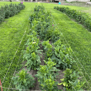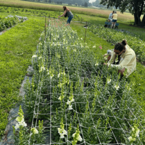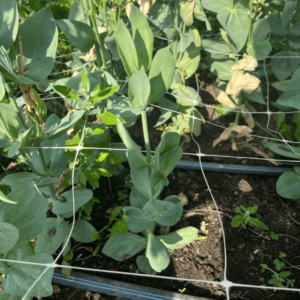 Again, the mesh (or the squares) works really well with plants with a lot of branches. I know some people use it for cosmos, but I’m going to give you a different example of a type of support to use for cosmos (what I use). Again, lisianthus, snapdragons, zinnias, and delphinium are what I use this square plastic netting for. It’s like four feet wide, and then there’s a little plastic square every six inches. At the end of your rows, you want to put some metal T-posts about four-feet wide. You put those in the ground at the two ends of the row and then unroll your netting for the whole distance. Then you’re gonna pull it tight at each end and have it so that it’s barely hovering above the plants. You want it maybe a foot off the ground when the plants are eight inches tall. It’s best if you can have two people do this so that it’s even, and you pull it tight along the sides as you’re going so that it’s suspended over the plants, and then the plants will actually grow through them. They’ll grow up through the holes. Again, you’ll want to do this when they’re about eight inches tall.