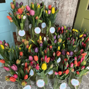 So, I tried to come up with a different recipe for my subscriptions every week. There are 50 subscriptions on Wednesdays in the summertime, so I need to make 50 bouquets. I typically have two or three different recipes for those just because of the number of flowers I need, and I’ll figure out which colors I want and see how it goes. Sometimes for fun, rather than setting them all out at once, I will set out half of them since there are two different color combinations. That way, I can make sure that people who come later in the day have the same opportunity to get their choice of colors. Otherwise, one of the color options is all snagged up first. It’s funny, though, because, for the most part, it really evens out. Sometimes with the tulips, just to see what will happen, I will put some in mason jars and some in floral sleeves and see what people take. Typically, it ends up being half and half. It’s like, “Oh, okay, well, that worked out pretty well.”