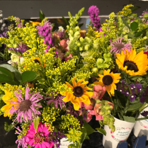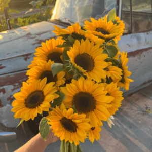 Now, I want to talk a little bit about focal flowers … sunflowers, lilies, peonies, dahlias, and then the large varieties of zinnias. I used to sell sunflowers in bunches of 6 for $12, but I quit doing that because I realized that I could take those same six sunflowers, mix them with some greenery, some zinnias, and some of my filler flowers in there, they’re just way less value-filled. Sunflowers are a “one-and-done” … they bloom, and then they are done, which makes them a more premium flower. So, I can make those premium flowers stretch a little bit farther by adding other types of flowers in there. Now I essentially sell each of those six sunflowers for $25 each because they’re mixed with other flowers. So, instead of, you know, $12 – $15 for just six sunflowers, now I sold them for more. Even if I did $15 for a bunch of just sunflowers, five bunches would bring in $75. Now, I can make $150 from them, literally just by adding some other flowers mixed in that are not my valuable, premium stems. Those premium stems I really like to try to divide out, and I don’t sell them in direct bunches anymore, even though it would be a lot less work to sell them that way, because you’re not taking the time to make the bouquets. Then again, I’m constantly learning. Maybe I’ll look back at this blog post and laugh, and maybe all I’ll do is sell straight sunflower bunches again in the future.