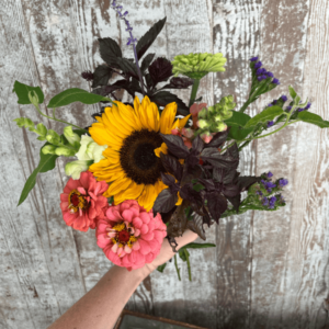 Here are a couple of the recipes for bouquets I mentioned earlier – one recipe would be one sunflower, two snapdragons, one amaranth, three zinnias, three honeywort, one statice, and one bupleurum. This would typically be for early July bouquets. Another one that would be more of a September bouquet would be one dahlia, three basil, two salvia, one amaranth, three zinnias, and then a nigella. Those are just a couple sample bouquets of what I usually do for my subscription bouquets. I hope that this makes it a little easier. Abbey, do you have any questions?