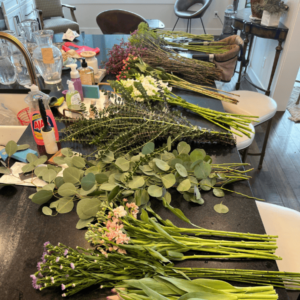 The first thing you’re gonna want to do is gather your supplies. When I’m making these bouquets to sell, for example, if I’m going to a vendor fair or some sort of market when I have my bunches of flowers in craft paper, I like to make about five bouquets of each combination because that’s how many fit in a bucket. Even if I have them in mason jars, kind of all next to each other, I like to have ones that look the same rather than spreading them out because I think it just looks nicer. I try to focus on things like, those are purple and orange, these are a bunch of light pinks, and those are a lot more whites and greens rather than mixing them all together on the table. For my subscription holders, if I make 50 bouquets and I have three different kinds to choose from, I will still divide them up a third, a third, rather than mix them all together, even though that might look nicer. I do this because it gets busy looking when they’re all mixed, and people can’t tell what they want. I also think they make a greater impact when they’re bunched together with the ones that look like them.