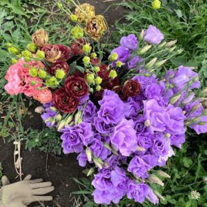 Lindsay has been amazing – she has basically been promoted to farm manager, and I, honest to God, could leave for a couple of weeks, and I know she can handle it. And then she had Brittany and Karen helping her. Don’t get me wrong, I’ve still definitely been outside with the flowers a lot – I’ve been on a lot of the evening events or Saturday morning events since they’re at the farm anyway, rather than making up the subscriptions and picking the flowers (the day-to-day work). There’s more work than one or two people can handle, for sure. So, one of the things Brittany did was go through and disbud lisianthus for like an hour. Then, it made it much quicker to harvest the lisianthus in groups because she could tell which colors she had already disbudded. They’re all kind of budding up at the same time, so she knew which ones she had already disbudded and could just glance, and if there were two or three flowers open on the same plant, she knew that it was ready to harvest. When there’s anywhere from two to four open after that first initial one, that’s when you harvest it. You want to cut it low, just above that second set of leaves, so that it produces another one. Now, again, it’s really up in the air whether or not we’re gonna get a second flush, but I’m optimistic. We will see.
